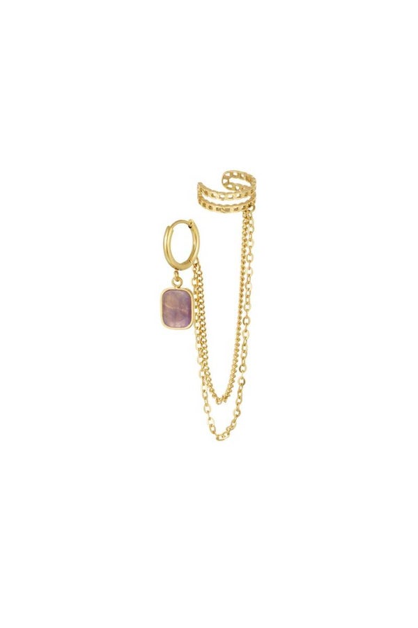 Trend alert!! Hoe tof zijn deze gouden oorbel & earcuf met paarse steen in één! De oorbel en earcuf zijn verbonden door een subtiel kettinkje, superleuk! De oorbellen hebben een vrolijke & speelse uitstraling en zijn daarmee uitstekend te combineren met meerdere matchende sieraden met steentjes! De oorbellen zijn gemaakt van stainless steel in combinatie met steen en hebben een afmeting van 10,5 cm. Verkrijgbaar in de kleurtjes: groen, roze en paars.