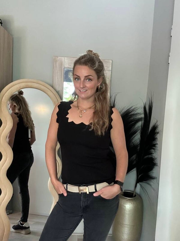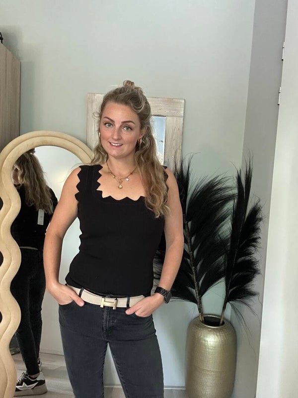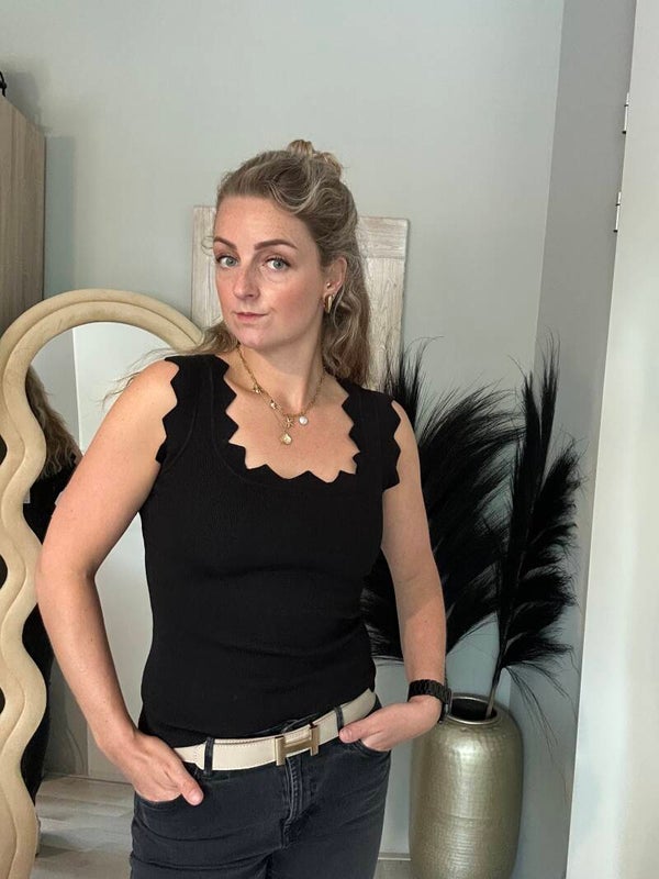Mooie mouwloze top van Moocci paris. Deze top is gebreid in een viscose kwaliteit en heeft goede stretch. Leuk om onder een blazer of vest te dragen.