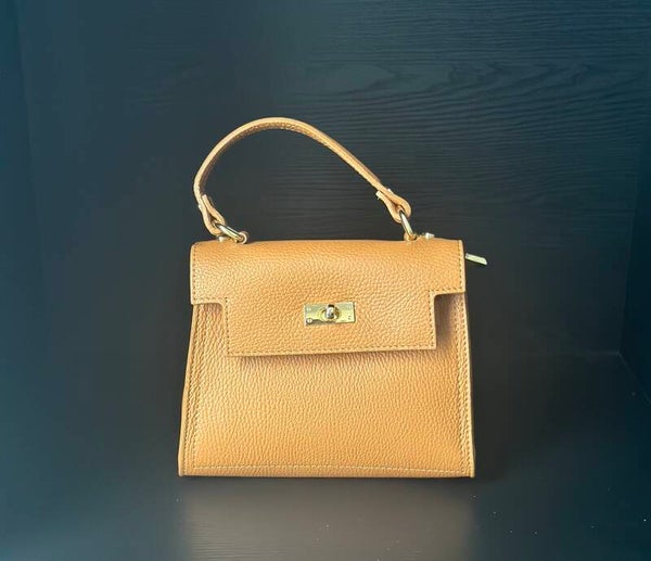 Mooie echte lederen handtas met draaislotje. De tas heeft drie vakken.