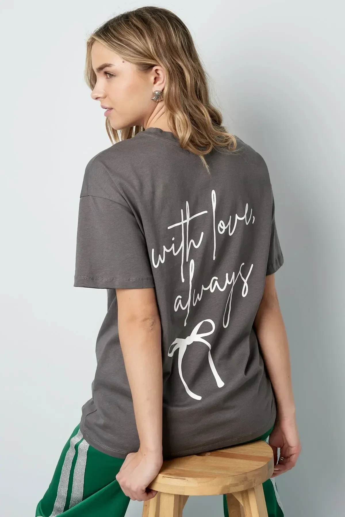 Voeg een vleugje speelsheid toe aan je outfit met het schattige With Love Always t-shirt! De stijlvolle tekst en het charmante strikje zorgen samen voor een frisse, trendy look die perfect is voor elke gelegenheid. Draag het en laat je persoonlijkheid stralen!