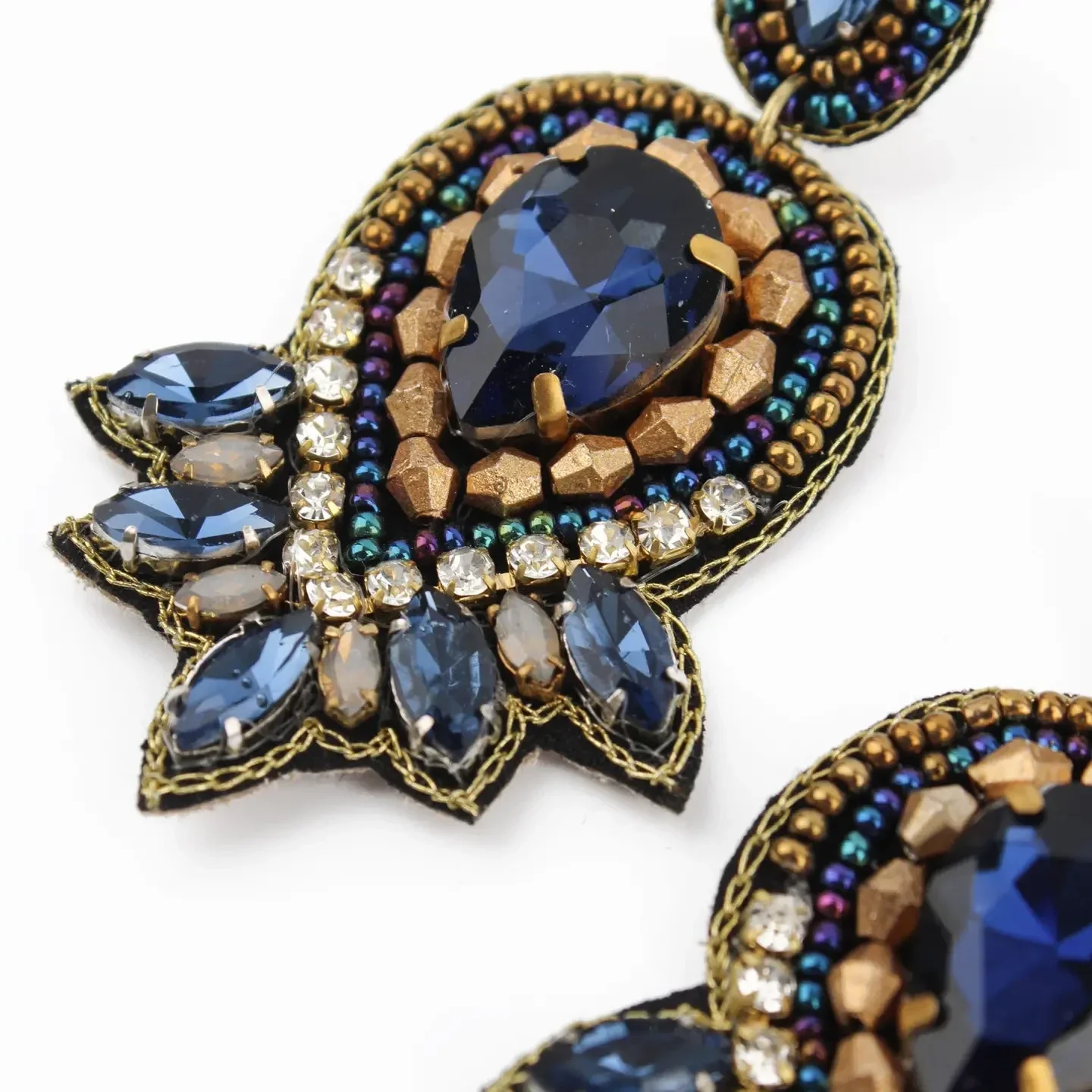 Oogverblindende art deco-oorbellen met een prachtige combinatie van blauwe, gouden en zilveren kralen en edelstenen. Handgemaakt.
