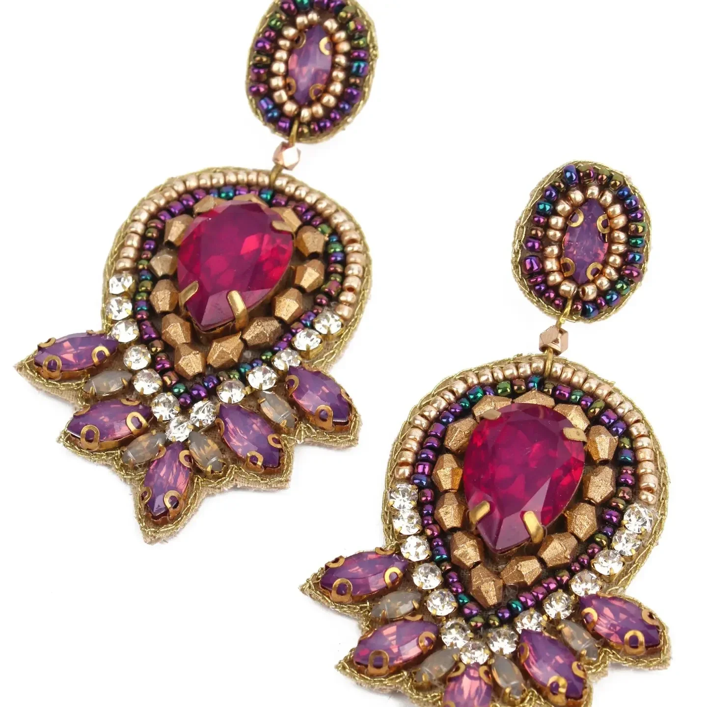 Statement oorbellen bezet met lichtvangende kralen en edelstenen. Zullen direct een wow-factor toevoegen aan elke outfit of gelegenheid. Ongeveer 46 mm lang x 40 mm breed met een bovenste stud van 18 mm x 13 mm. Lichtgewicht stoffen achterkant.